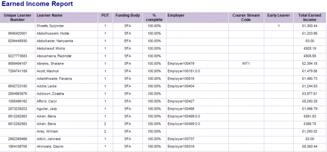 The report lists learners, their total framework progress percentage and their earned income (i.e. their total income to date multiplied by their total framework progress percentage).