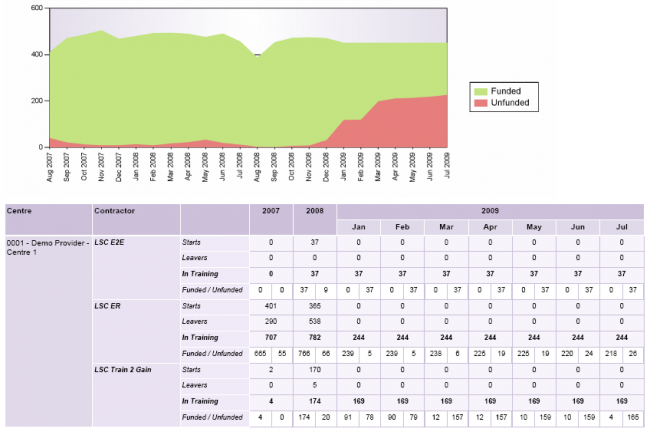 The Funded/Unfunded Learners report shows the trend of funded and unfunded learners over a period of time.