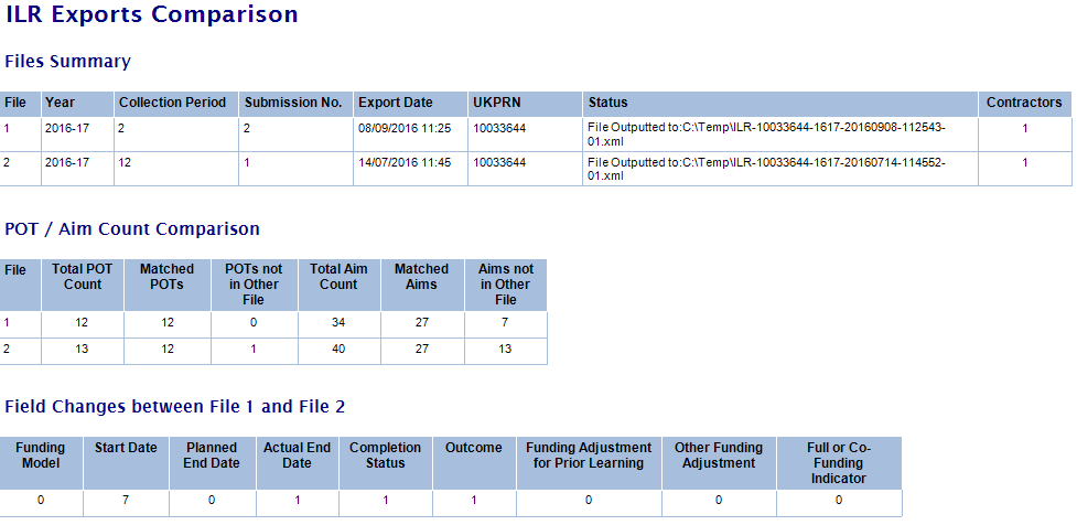 Note that where a row in an ILR entity is in one file but not the other, only fields in that entity that have a value entered are counted as a change. For example, if a learning delivery row is in file 1 but not file 2 and the actual end date is not entered in file 1, actual end date would not show as having a change for that row (essentially because there is nothing to show for it). Fields on that row where data is entered would show as a change, though.