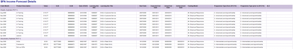 The report lists claim lines, grouped by learner and ordered by claim month. If a learner has not yet achieved an aim, the achievement is forecasted for the aim planned end month.