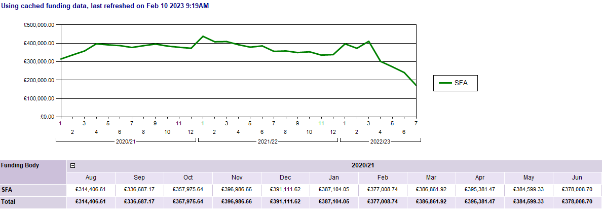 The Income YTD Summary report shows the income for each period in the selected contract years, based on the funding information calculated in Maytas. Clicking on a figure will show the income per learner that comprises that figure.