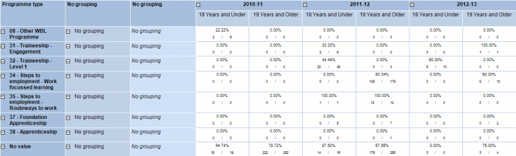 The report shows the activity success rates, grouped by up to three row groupings and one column grouping. The columns also group by contract year.