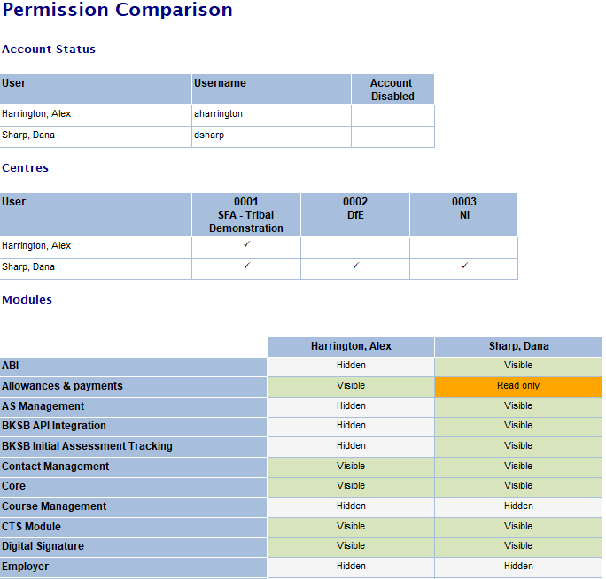 The Permission Comparison report lets you choose two Maytas users or groups and compare their permissions for centres, system modules, tabs, processes and templates.