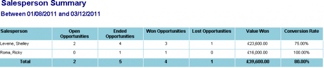 The report lists each salesperson and their number of open, ended, won and lost opportunities in the timeframe. It also shows the total value of won opportunities and the salesperson's conversion rate (i.e. the number of opportunities they have won compared to the number of opportunities they have closed).