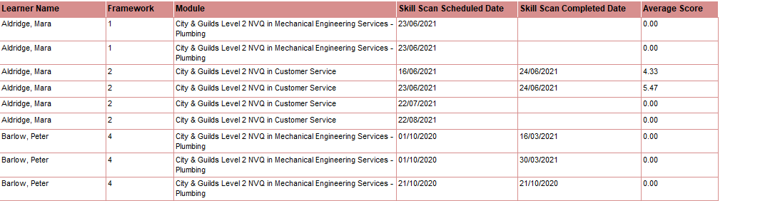 The Skill Scans List report lists learners who have upcoming or completed skill scans in a date range.
