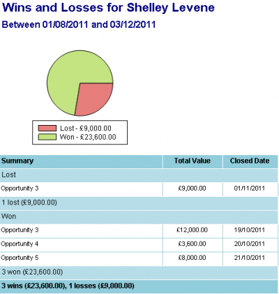 The Wins and Losses by Salesperson report shows a list of won and lost opportunities for a specific salesperson between two date parameters.