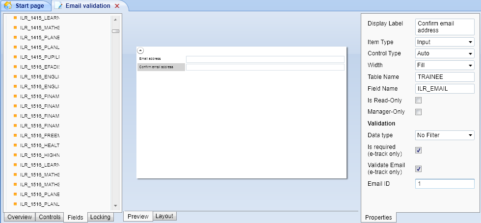- Drag another email field onto the design area (e.g. TRAINEE.ILR_EMAIL). This will be used as the confirmation field.