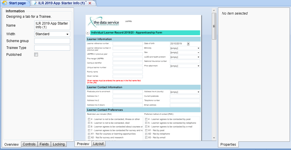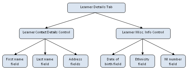 A control can consist of a collection of other controls, in a hierarchical fashion. For example, a learner's name, address and telephone number fields could be placed on a control called 'Learner Contact Details'. All the fields placed on the control are then grouped within it. The Learner Contact Details control could then be placed onto a larger control called 'Learner Profile', which also contains a control consisting of date of birth, ethnicity, etc. The principal of controls is that tabs often have common collections of the same data, and so this data can be grouped together into single, larger controls to make it easier to create tabs.