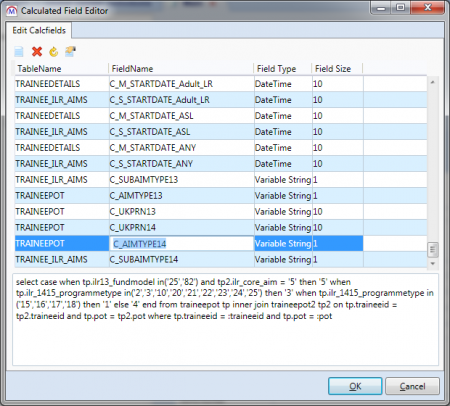 This allows you to create and update calculated fields (i.e. fields which are derived via SQL). For example, the Aim Type field on the ILR is a calculated field, as the value is derived from the Funding Model, EFA Core Aim flag and Programme Type. It is important to note that calculated fields cannot be directly edited; instead they simply display the value produced by the SQL.