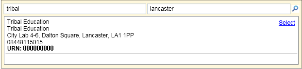 Enter an employer name in the top-left box and click the magnifying glass at the top-right to search. You can optionally also search by town or postcode. This will return a list of possible matches. Click Select for the correct employer and this will populate the field specified in step 5 with the employer’s URN.