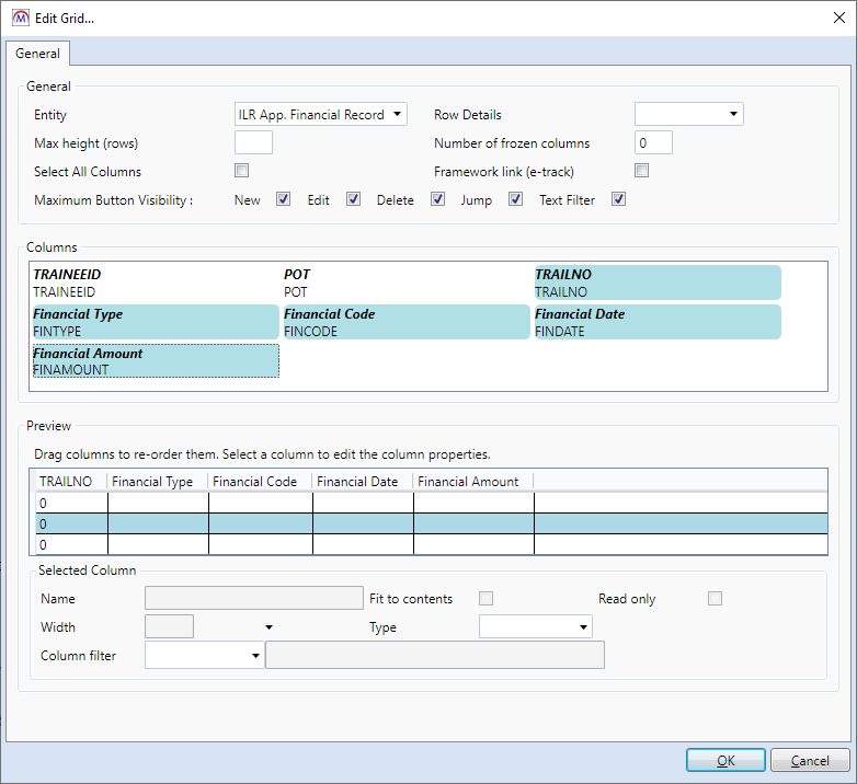 - Select an Entity. This is the table which the grid will be linked to. In this example we are using the ILR apprenticeship financial record.