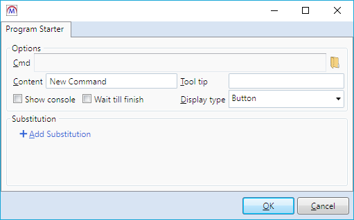 A program starter control is a button which runs an external program when clicked. You will see the following window when a program starter is added to a screen: